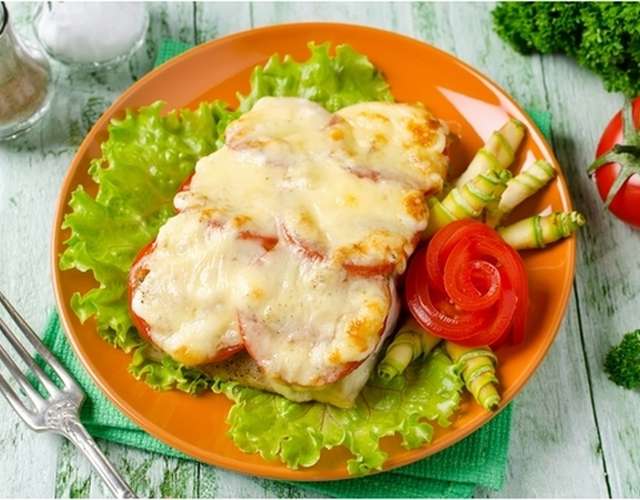 Зверху викладіть нарізані помідори та поставте в духовку на 20 хвилин при 160-180 градусах. Дістаньте, щедро притрусіть сиром та поверніть в духовку, щоб сир розплавився та запікся. Смачного!