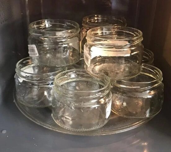 Тепер заливаємо в кожну банку 50 мл води і ставимо в мікрохвильову піч так, щоб тара не стикалася між собою.
