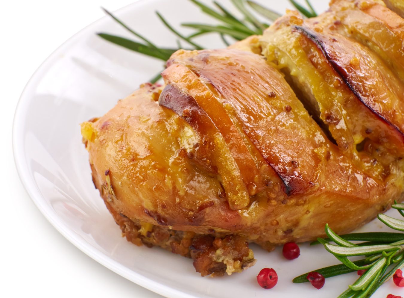 Перед запіканням додайте будь-які фрукти, наприклад, яблуко, персик, грушу. Фруктовий сік збереже соковитість самого м’яса, ви отримаєте дуже ніжне філе. Ароматний присмак фруктів буде чудовим у салатах і з різними гарнірами.