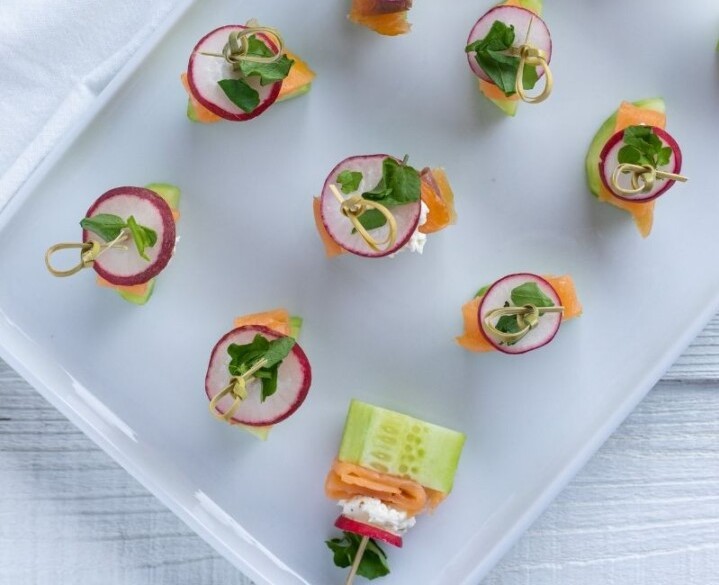 Тепер треба просто зібрати інгредієнти на шпажку. Основа — кубик огірка. На ним має бути шматочок риби, далі сир з хріном і закриває композицію редиска з невеликим зеленим листочком чи його фрагментом.