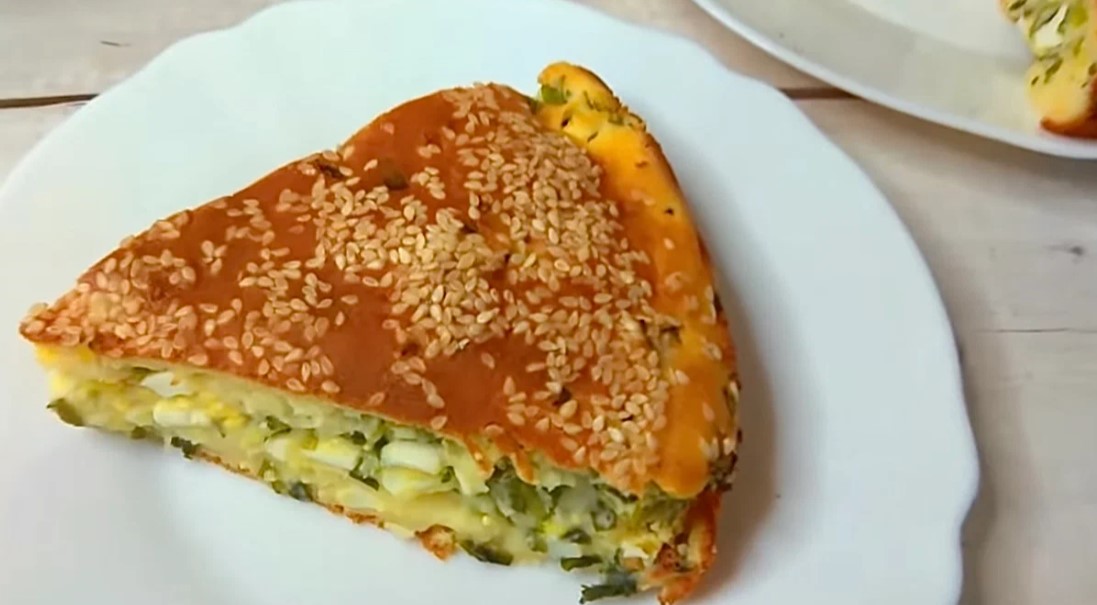 Змастіть форму олією й вилийте туди половину тіста. Начинку викладіть рівномірно й залийте залишком тіста. Посипте зверху кунжутом й поставте у духовку. Випікайте при температурі 180 градусів протягом 45 хвилин.