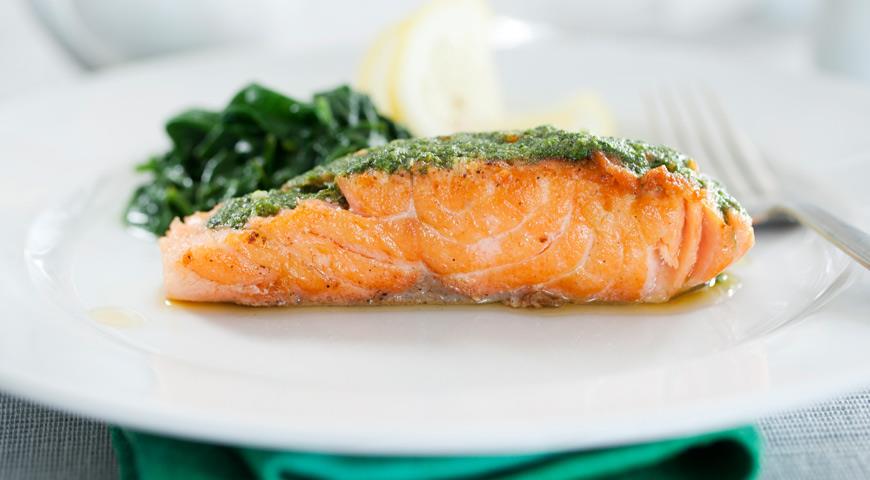 На вечерю є ідея приготувати лосось, але не просто його запекти в духовці чи посмажити на грилі. Доповнити рибу можна солодким соусом чилі та подати зі шпинатом.