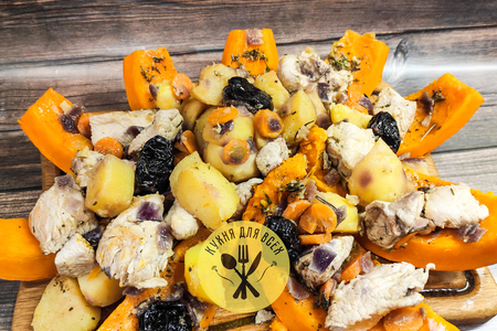 - Приготовление: Курицу нарежьте кубиками, тыкву и овощи – соответствующими кусочками. Смешайте все ингредиенты с маслом, специями и запекайте до готовности.