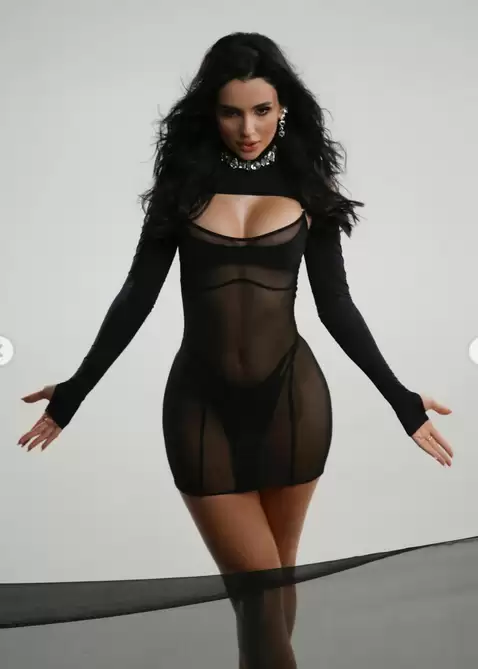 Перед камерою постала в ультракороткій прозорій сітчастій чорній сукні з глибоким декольте та у комбінації з білизною, яка підкреслила її ідеальну фігуру.
