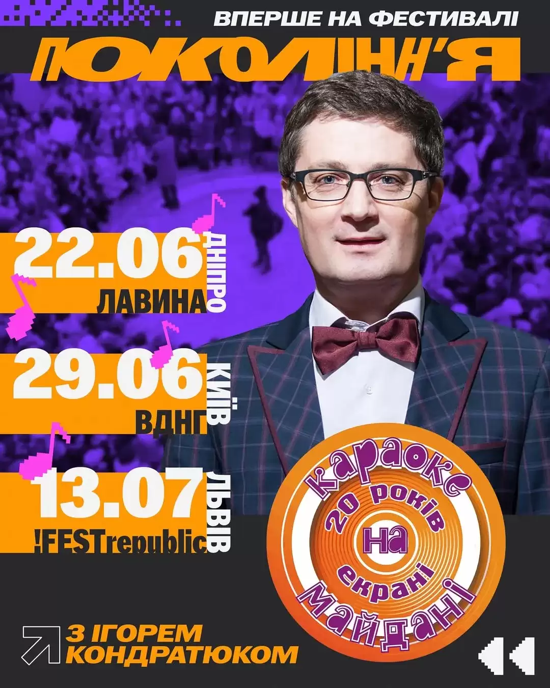Кондратюк проведе шоу “Караоке на майдані” на фестивалі “Покоління”. Символічно, але це той самий захід де напередодні його колишній підопічний, співак та військовослужбовець Віталій Козловський повернувся на сцену після розв’язання скандальних питань з Ігорем Васильовичем. Ба більше – виконав старі хіти, які викупив в Кондратюка.