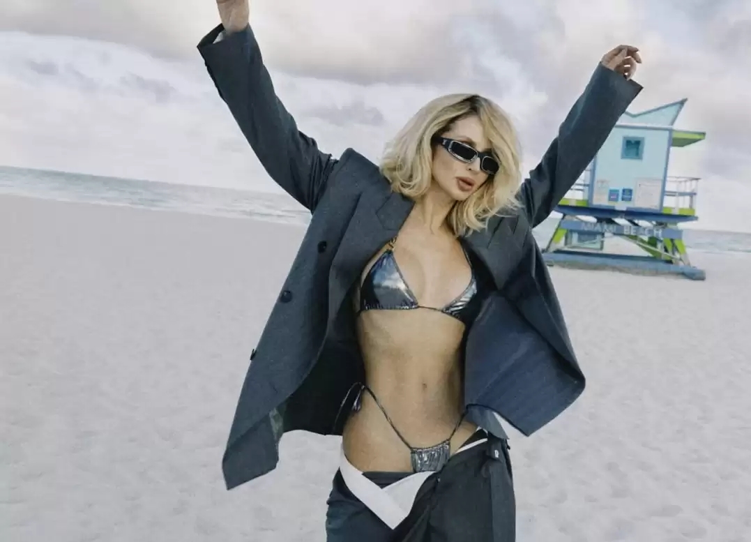 Зірка попозувала на пляжі у срібному бікіні, сірому піджаку та розстібнутих штанях.
