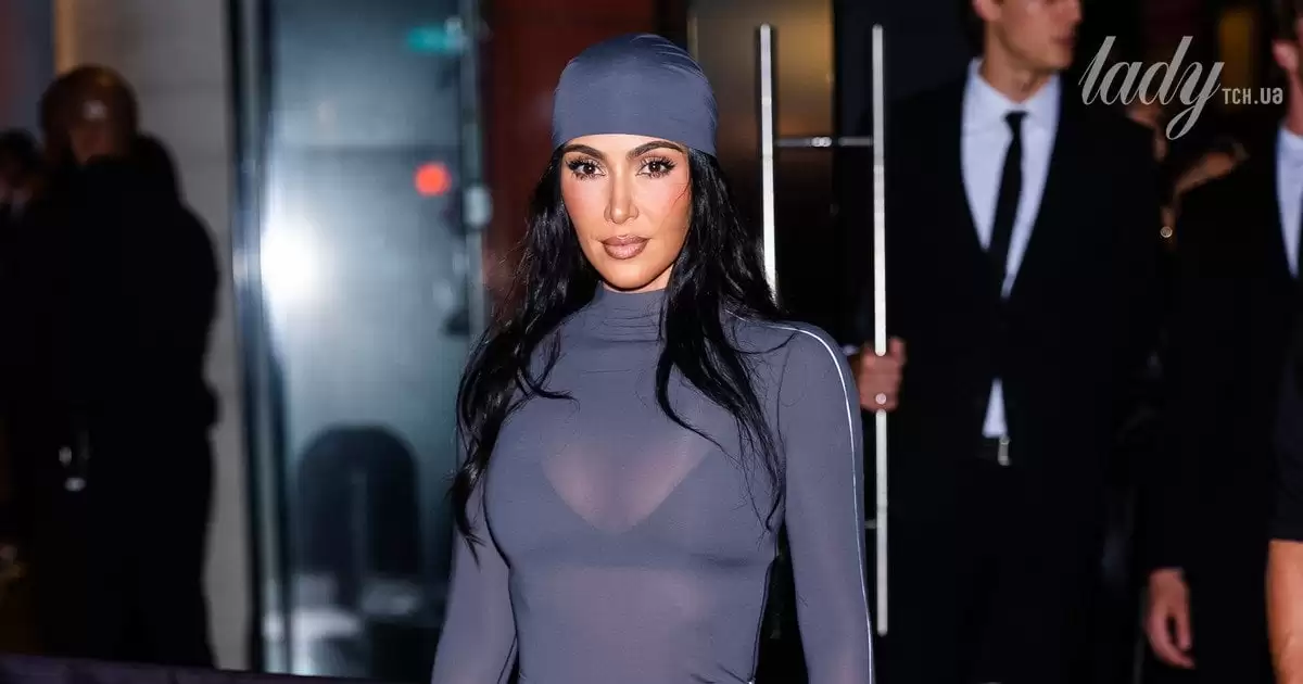 Також на Кардашян були гостроносі ботильйони в тон її сірого лука, а на голові — бандана. Кім зробила яскравий макіяж у коричневій гамі, а також нюдовий манікюр.