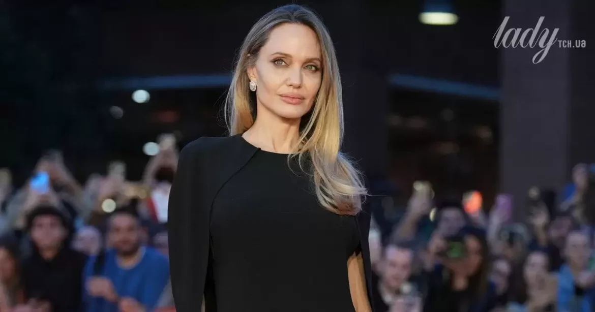 Для виходу на публіку Джолі обрала лаконічне чорне вбрання. На ній була чорна сукня довжини міді з кейпом та глибоким вирізом на спині.