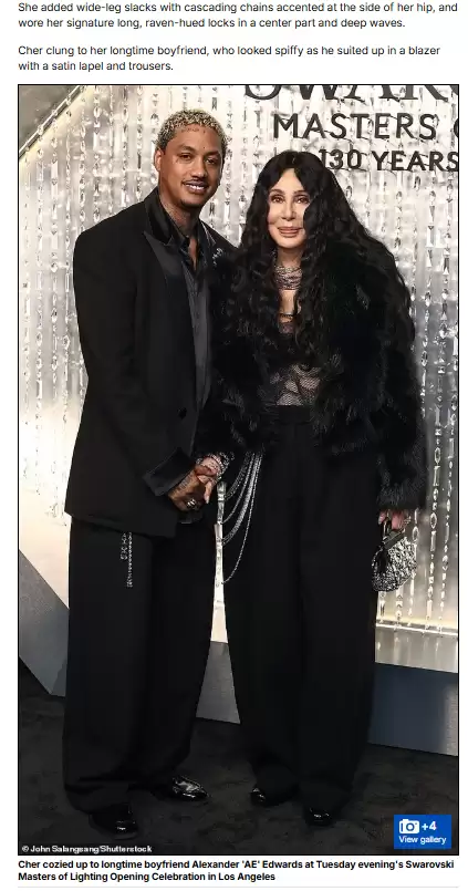 Шер та Александр відвідали урочисте відкриття виставки Swarovski Masters of Lighting у Лос-Анджелесі. Для цього заходу співачка вибрала total black look (фірмовий колір пари): сітчасте боді, коротку шубку, чорні широкі штани, які вона прикрасила кількома сріблястими ланцюжками. Також образ артистка доповнила прикрасами на шиї та невеличкою сумкою. На одному з фото Шер міцно тримала свого коханого за руку, який також вибрав для вечора чорний колір. Він з’явився на публіці у чорному класичному костюмі й також доповнив свій аутфіт ланцюжками.