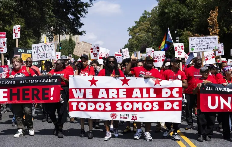 Учасники маршу «Ми всі — Вашингтон», серед яких були й нелегальні іммігранти, і прихильники створення палестинської держави, скандували гасла проти Трампа та несли плакати з написами «Трамп має піти зараз», «Вільний Вашингтон» і «Чини спротив тиранії».