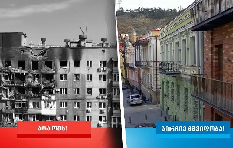 На відео, яке учора завірусилося в мережі, використали чорно-білі кадри українських міст, знищених росіянами, поховання українських військових, подружжя, яке стоїть біля завалів багатоповерхівки в Києві, де загинув їхній син. Протиставляють цьому кольорові фото грузинських міст. На лівій частині відео надпис “Ні війні!”, на правій — “Обирай мир”. А слоган під роликом такий: “Мир Грузії – більше добра для Тбілісі”.
